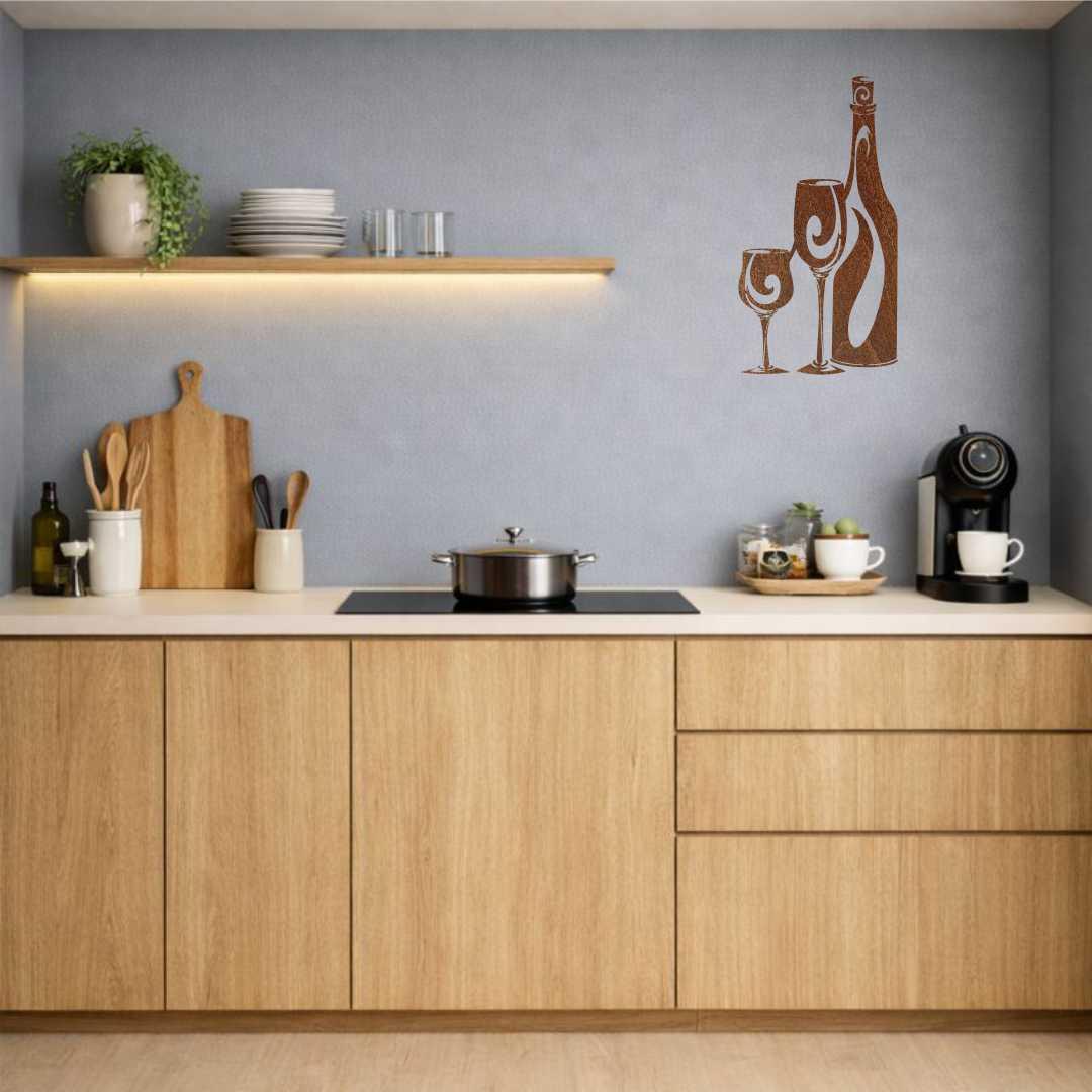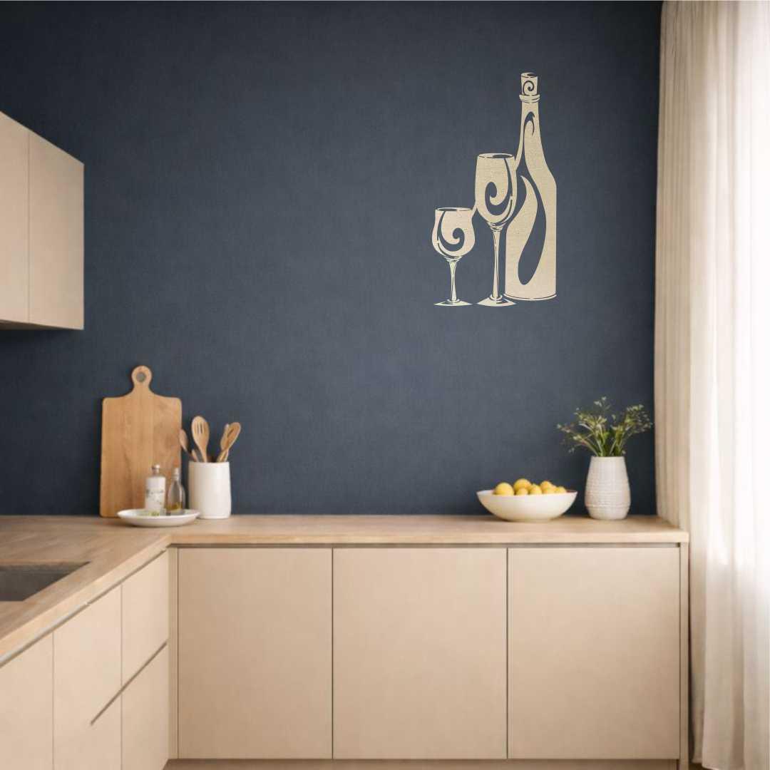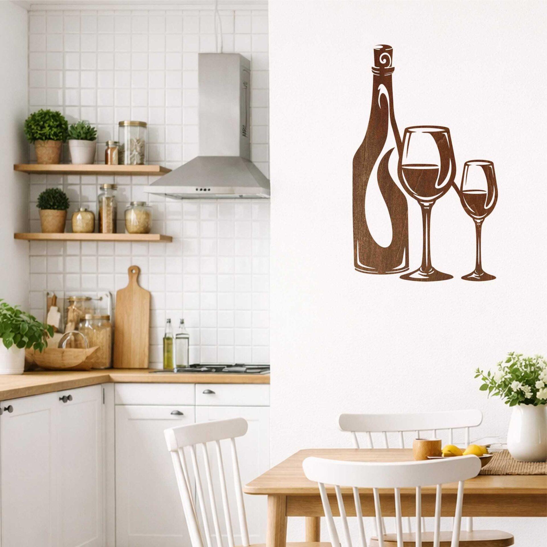 Obraz ażurowy Butelka i kieliszki wina to elegancka dekoracja ścienna inspirowana butelką i kieliszkami, idealna do kuchni, jadalni lub domowego barku.