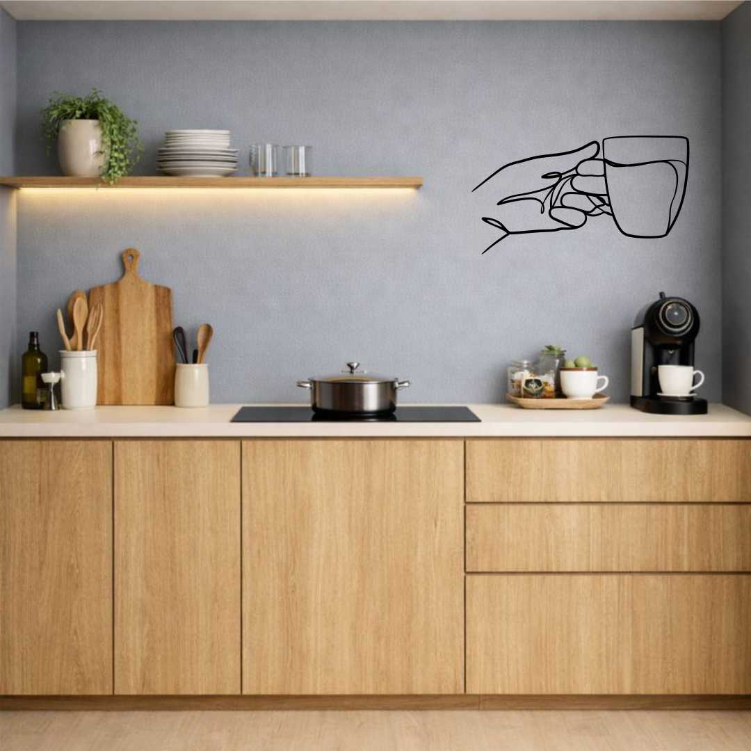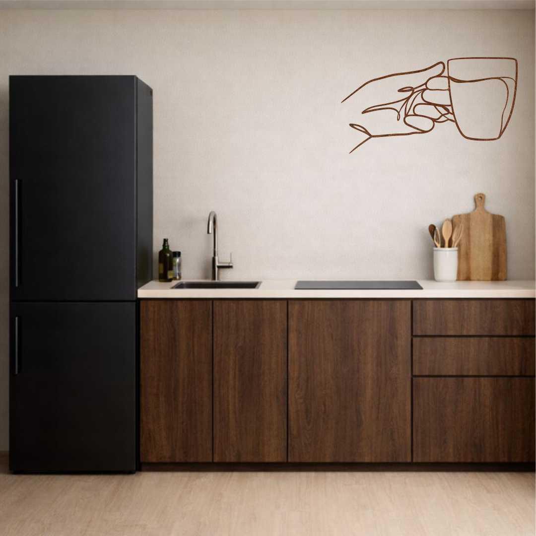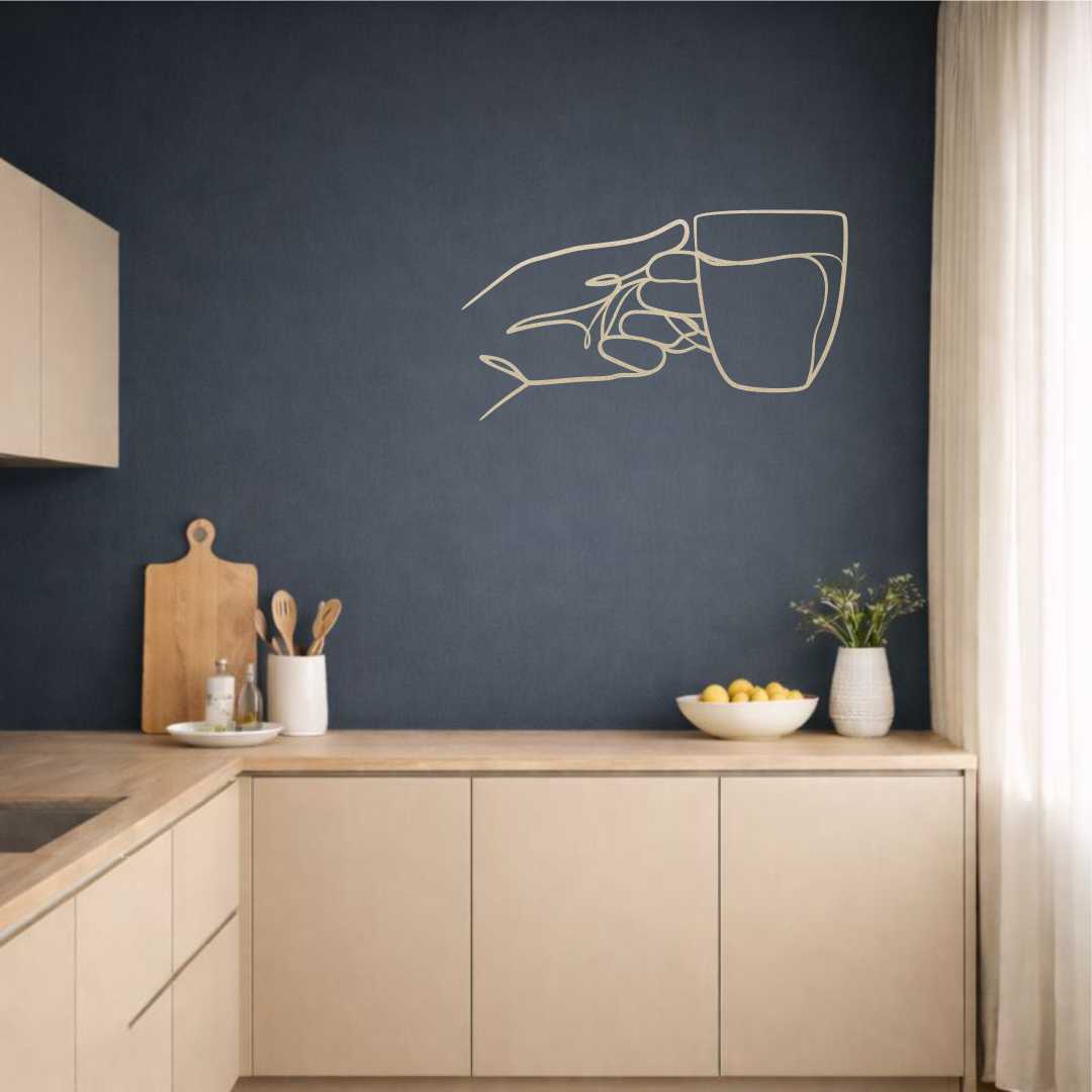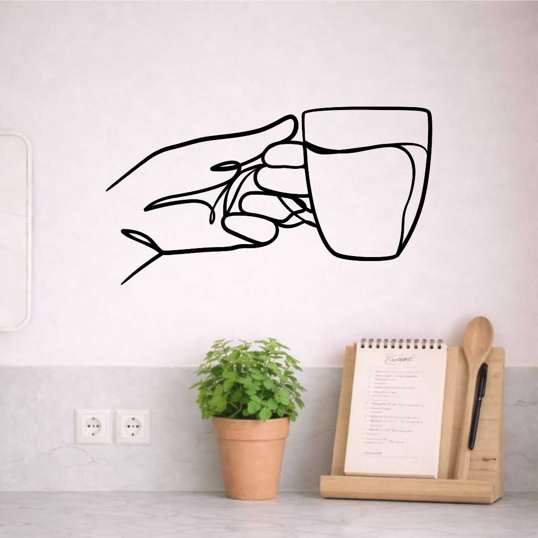 Obraz ażurowy filiżanka herbaty w dłoni to minimalistyczna dekoracja ścienna do kuchni, przedstawiająca delikatny gest trzymania filiżanki i spokojny rytuał herbaciany.