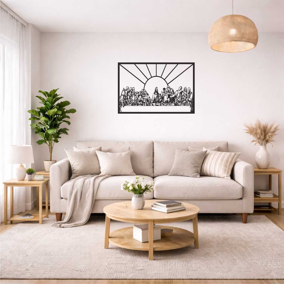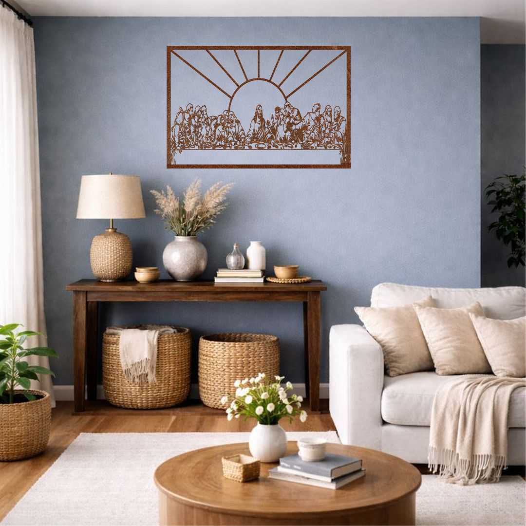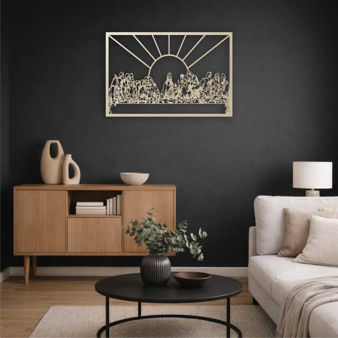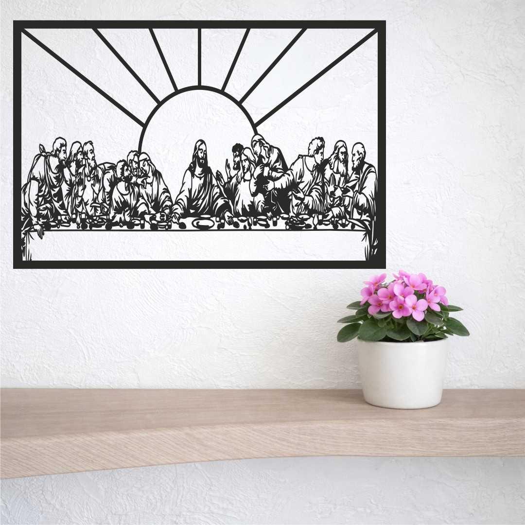 Ostatnia Wieczerza – obraz ażurowy to klasyczna dekoracja religijna, która w czytelny i symboliczny sposób podkreśla duchowy charakter wnętrza. Przedstawienie Chrystusa i apostołów przy wspólnym stole nawiązuje do jednego z najważniejszych momentów Ewangelii. Ażurowa forma nadaje całości lekkości i sprawia, że obraz nie przytłacza przestrzeni mimo rozbudowanej sceny. Doskonale sprawdzi się jako dekoracja religijna na ścianę w salonie, jadalni lub domowym miejscu modlitwy. Geometryczne promienie w tle wzmacniają kompozycję i przyciągają wzrok. Różne rozmiary pozwalają dopasować obraz do mniejszych i większych ścian. To również ponadczasowy pomysł na prezent o głębokim znaczeniu religijnym.