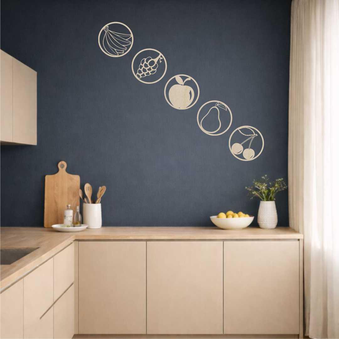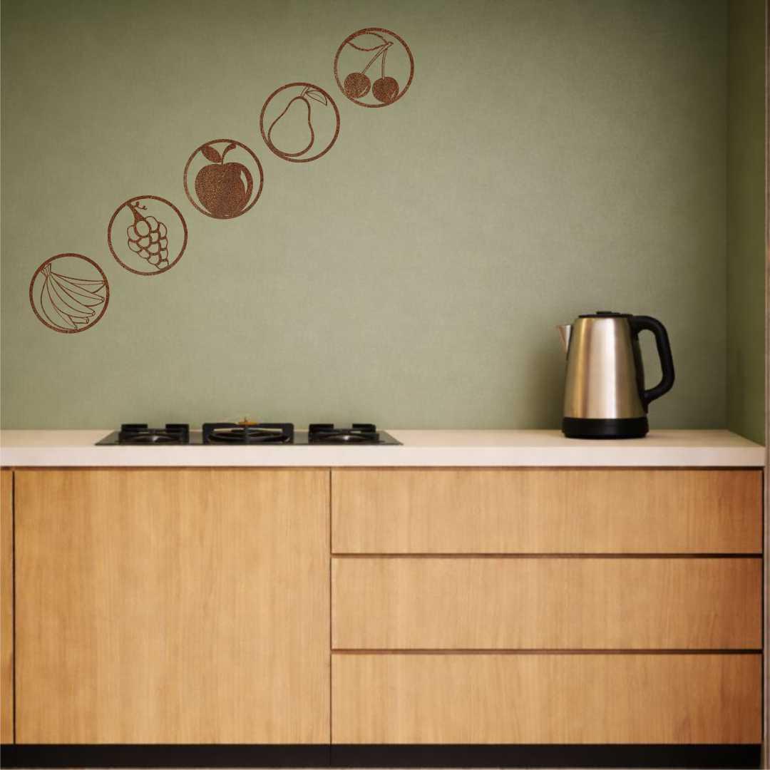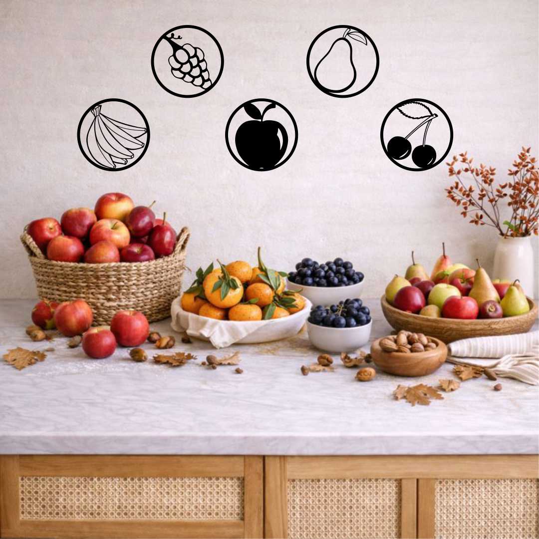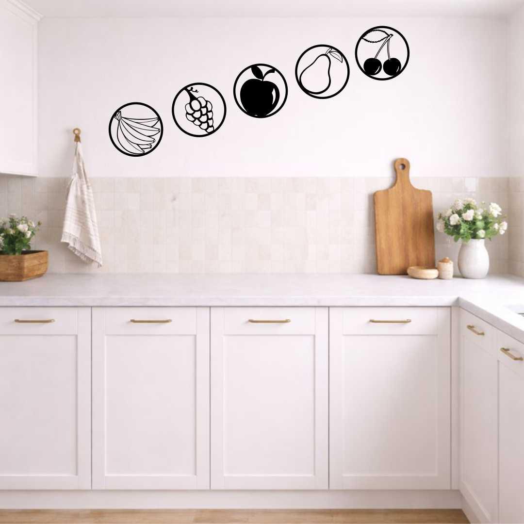 Zestaw ażurowy owoce to nowoczesna dekoracja ścienna do kuchni, składająca się z pięciu obrazów przedstawiających owoce w minimalistycznych okręgach. Każdy motyw tworzy spójną całość, dzięki czemu zestaw doskonale porządkuje przestrzeń nad blatem lub stołem. Okrągła forma nadaje dekoracji lekkości i nowoczesnego charakteru. Zestaw świetnie sprawdzi się w kuchniach skandynawskich, nowoczesnych i naturalnych. Ażurowa konstrukcja sprawia, że obrazy nie przytłaczają wnętrza, nawet w większych rozmiarach. To idealna propozycja dla osób ceniących harmonię i motywy inspirowane naturą. Dekoracja sprawdzi się również jako wyjątkowy prezent do nowego mieszkania.